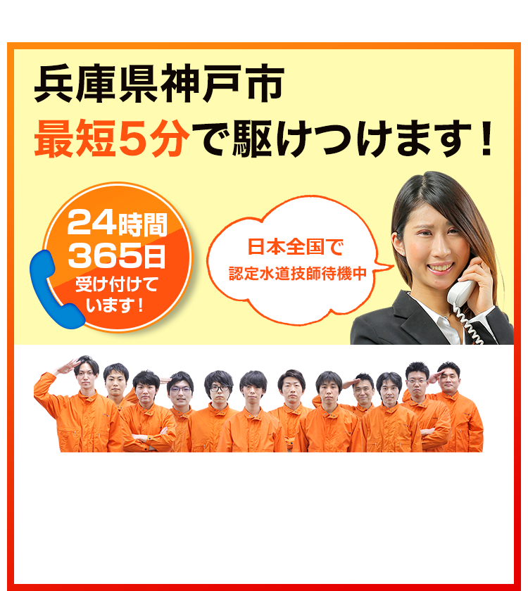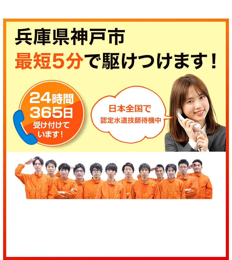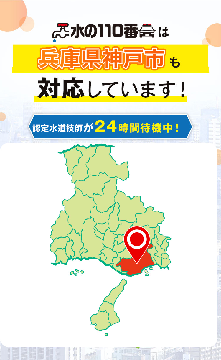 神戸市内、三宮からポートアイランド、有馬温泉まで、最短5分で急行。24時間365日、神戸市のどこへでも迅速対応。トイレつまり・水漏れ問題、即時解決へ。